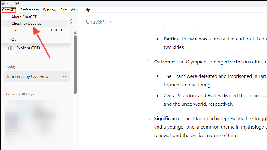 - The ChatGPT desktop application automatically detects updates and informs you about them, so you can install them. You can also manually update the application by clicking on the 'ChatGPT' menu at the top left and then on the 'Check for Updates' option.