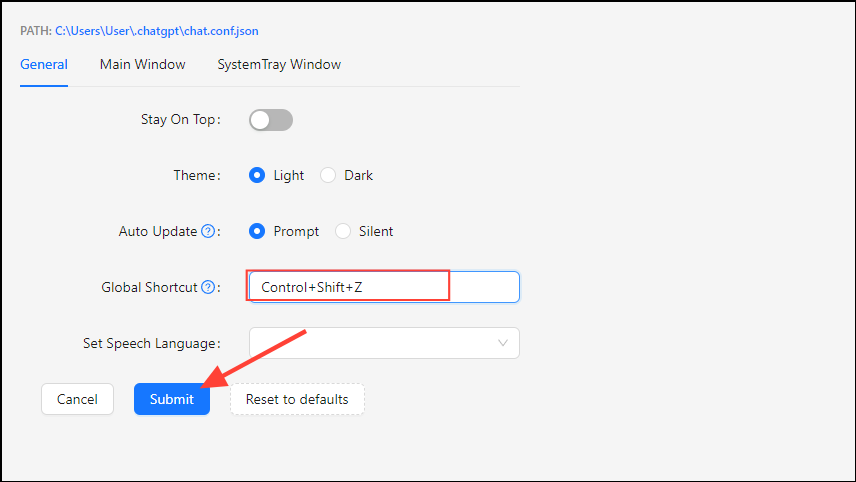 - When the Control Center opens up, enter your keyboard shortcut in the 'Global Shortcut' box and click on the 'Submit' button. Now you can use this keyboard shortcut to bring up the ChatGPT application at any time, just like with the official Mac app.