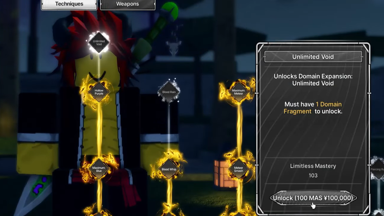 Step 1: Confirm that your cursed technique mastery is at 100 and that you have at least 100,000 Yen. If masteries lag behind, continue fighting or running raids until the bar is capped.