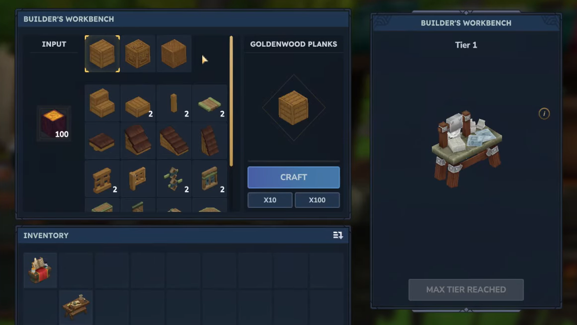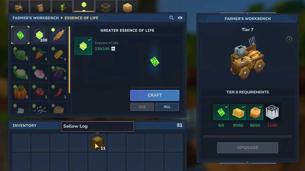 The Farmer’s Workbench checks for Goldenwood Trunks when upgrading to Tier 8. Sallow Logs always satisfy this requirement because they are explicitly categorized as Goldenwood Logs. Palm logs from eligible chests can also count where the requirement is written as “Goldenwood” rather than “Sallow”.