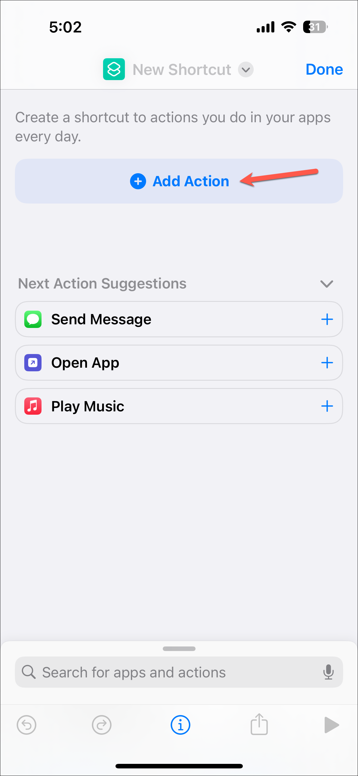 - The screen for creating a new shortcut will open. Tap on 'Add Action'.