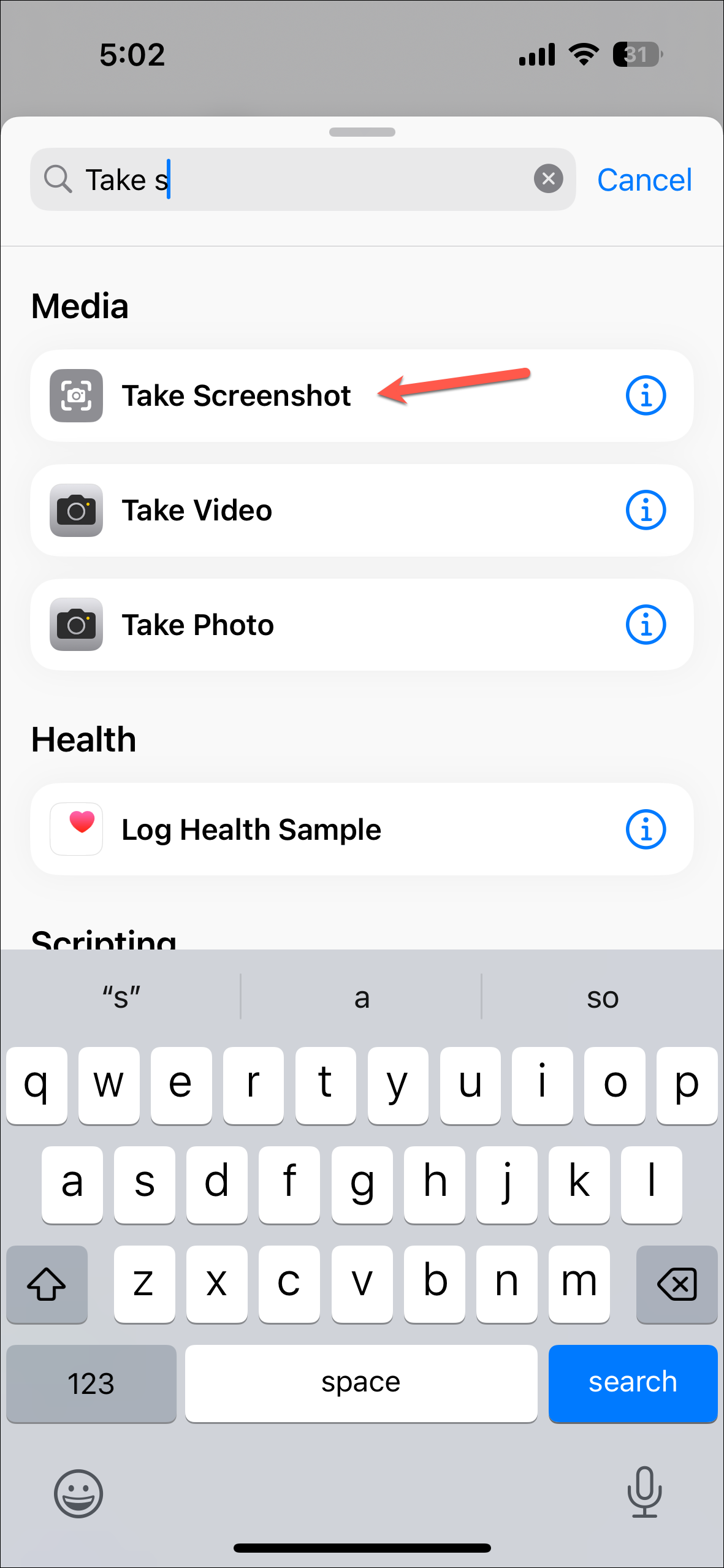 - Go to the search bar, search for 'Take a screenshot', and tap on it from the results.