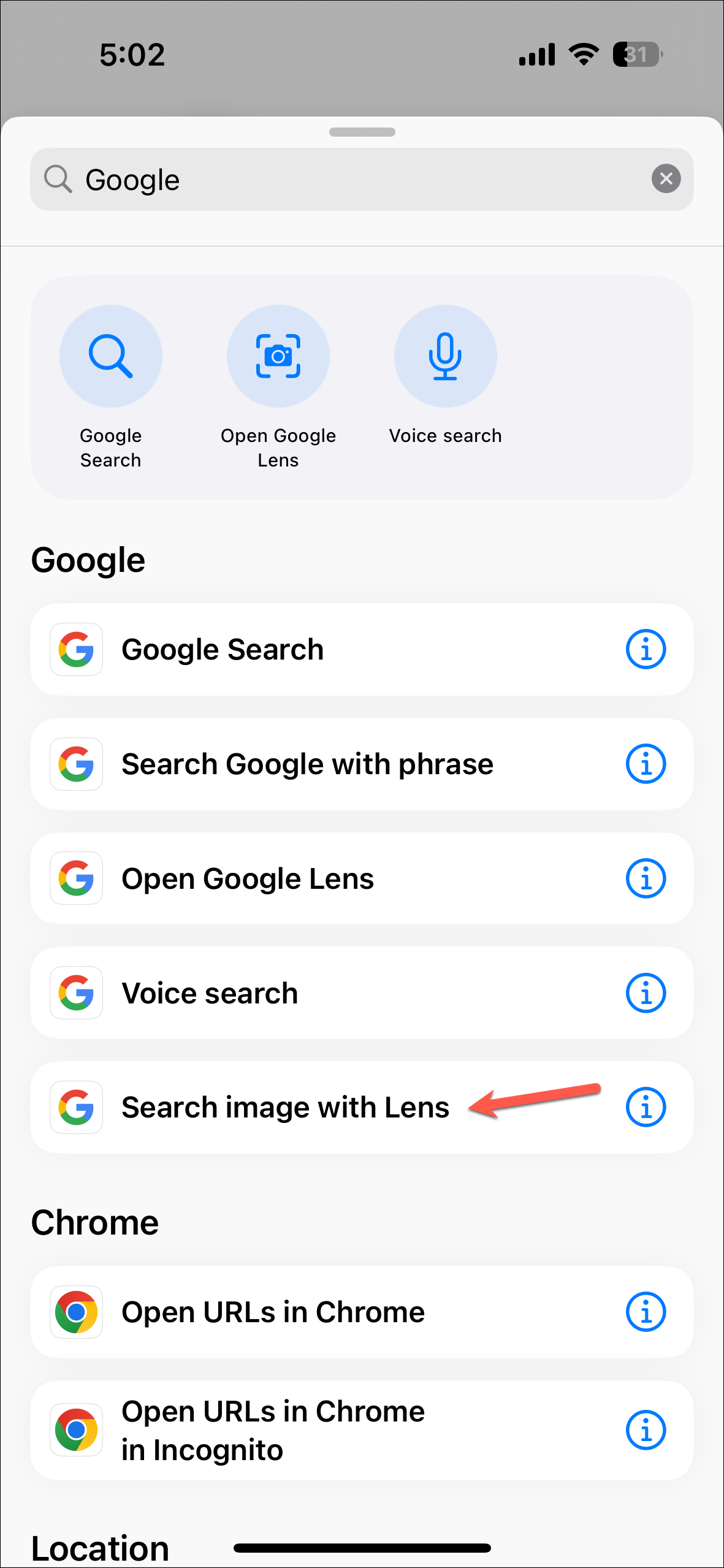 - Search for 'Google' and tap on the 'Search image with Lens' option from the results.