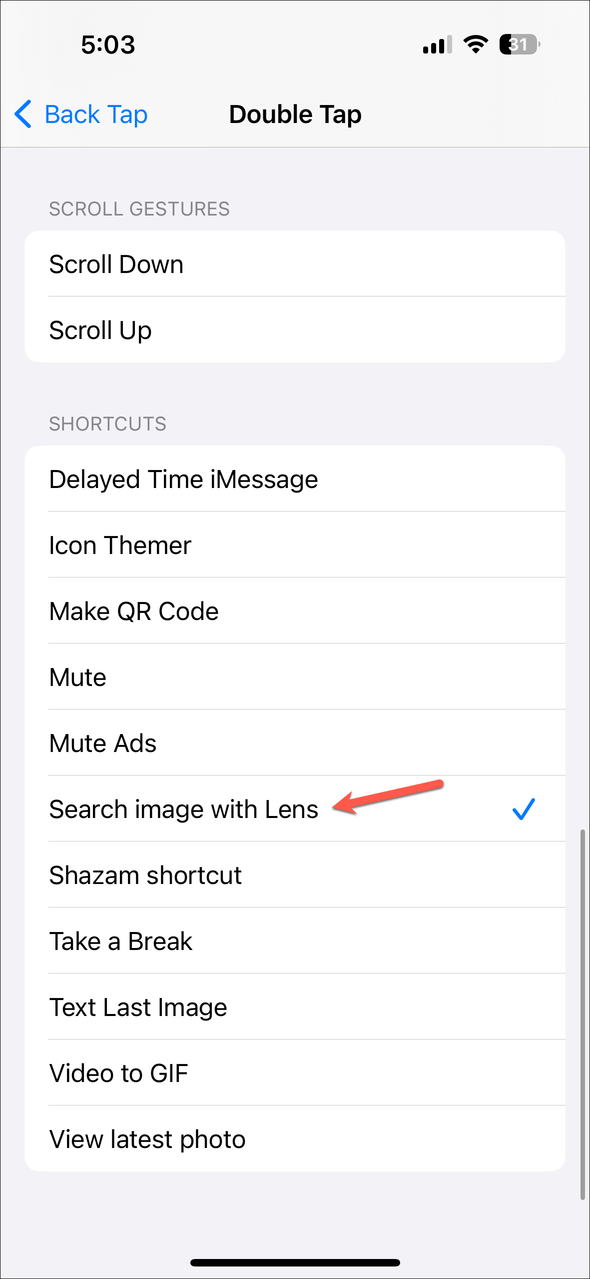 - Scroll down to the Shortcuts section and select the 'Search image with Lens' shortcut from the list.