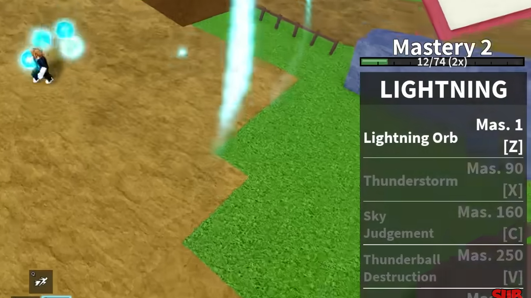The orbs provide a visual indicator of available charges. When all three orbs are present, the player can execute charged versions of certain moves. The M1 basic attack chains lightning between nearby enemies and consumes orbs when used, though it deals relatively low damage compared to the fruit's special moves.