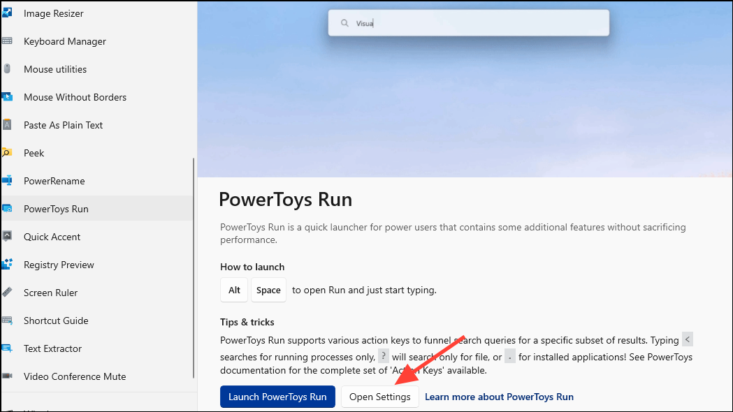 - With the PowerToys Run option selected, you will see the description of the utility on the right side. To be able to use the Spotlight-like search feature on Windows, you will need to enable the module first; click the 'Open Settings' button on the bottom.