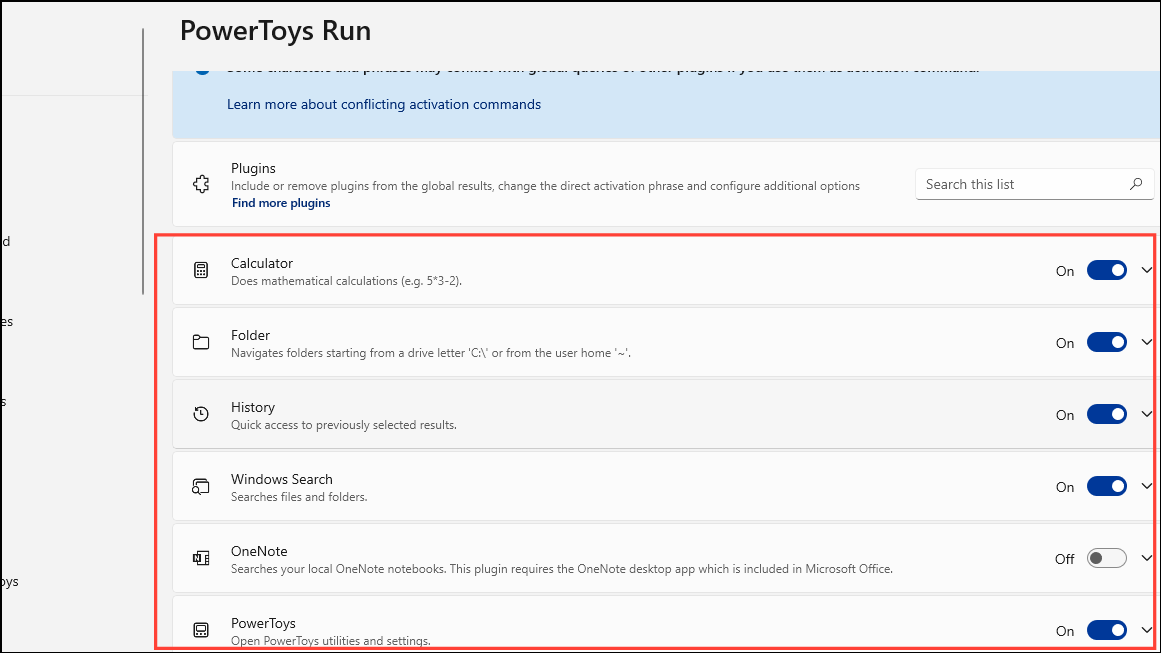 - To enable a plugin, simply turn on the corresponding toggle on the right side and use the key assigned for that plugin when typing in the PowerToys search bar.