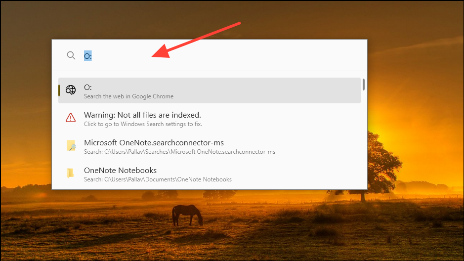 With the plugin enabled, press the shortcut keys to launch the Powertoys search box and typeO:in the box. This will direct the tool to search your OneNote notebooks. Enter a specific name after the 'O:' command to look for it.