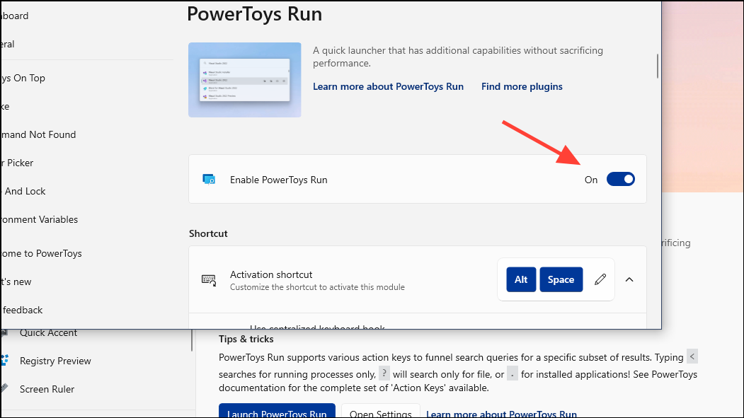 - Make sure the button labeled 'Enable PowerToys Run' is toggled on.