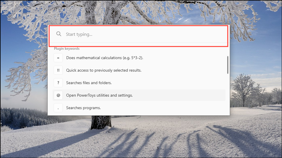 Alt+Spacekeys or the shortcut keys you've chosen to bring up the PowerToys Run search bar on your screen. The search box will be accompanied by a few suggestions.
