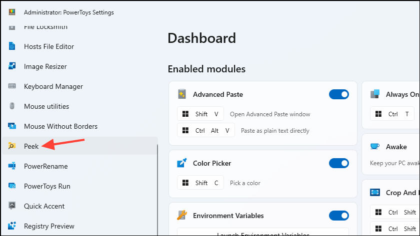 - You will find all the utilities that PowerToys offers on the left. Scroll down and click on the Peek utility.