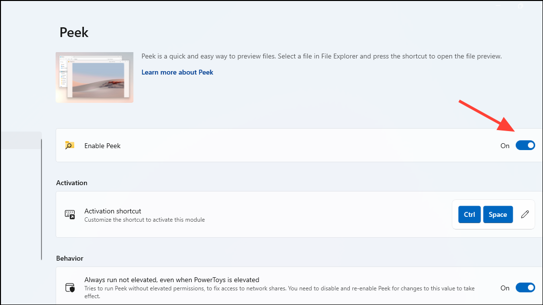 - Then click on the 'Enable Peek' toggle on the right to turn on the utility.