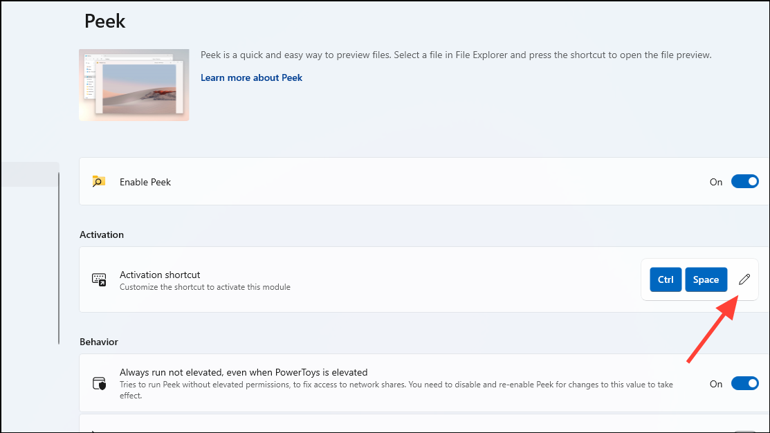 - The shortcut keys you need to use to preview files using Peek will be displayed here. You can change them by clicking the pencil icon next to them. Just make sure your shortcut keys start with the