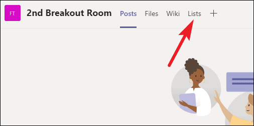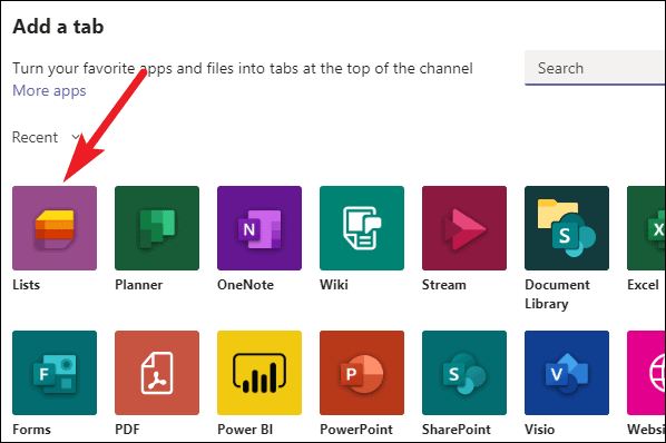 The ‘Add a Tab’ window displaying some of the most popular apps you can add as a tab will open. Lists should be among these apps. Click on it. If it isn’t, search for it from the search bar and then click on it to add it as a tab.