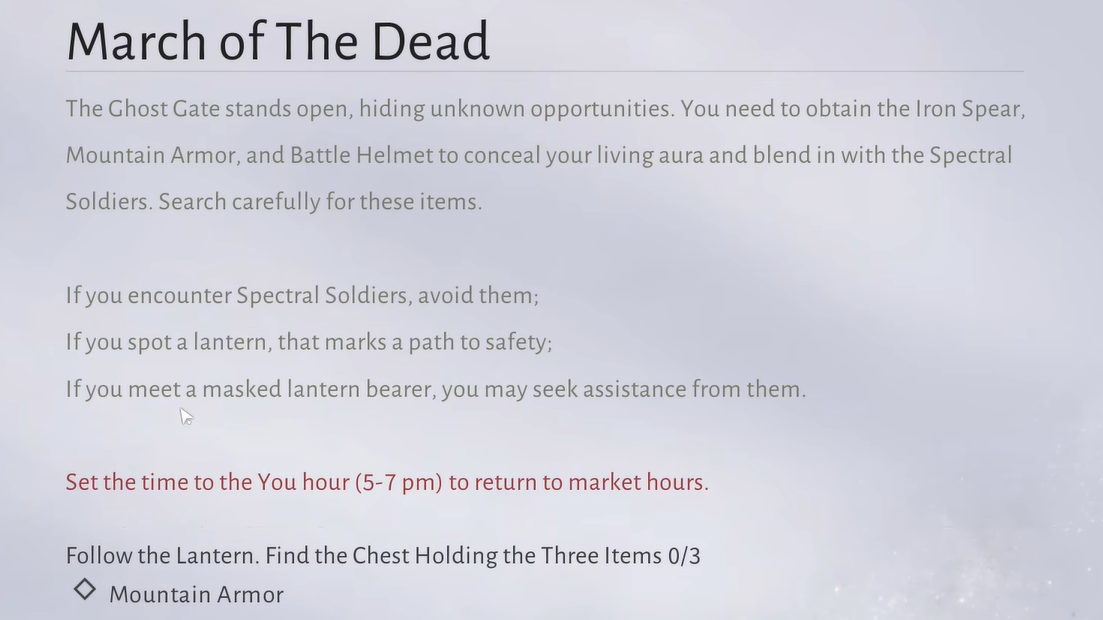 Once Mountain Armor is safely in your inventory and turned in, the most difficult part of the quest is behind you. With the Spectral Soldier Armor equipped, the Ghostlight Market stops being a lethal stealth maze and becomes a somber parade route leading straight to the Ghost Gate and Zhu Yousheng’s arena.