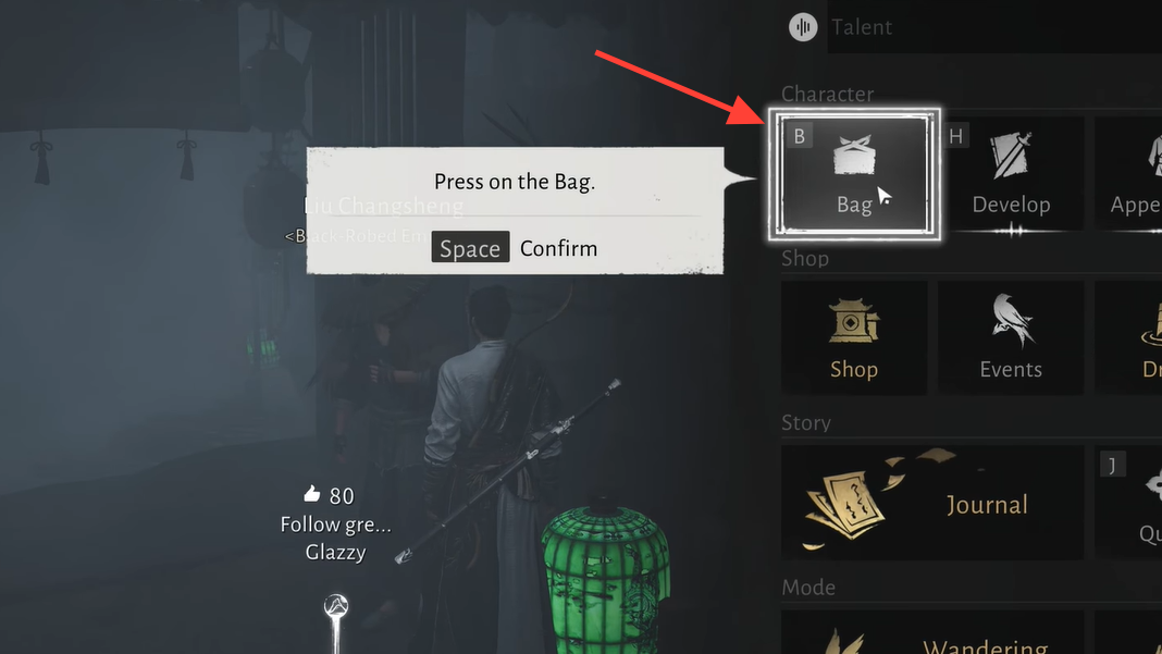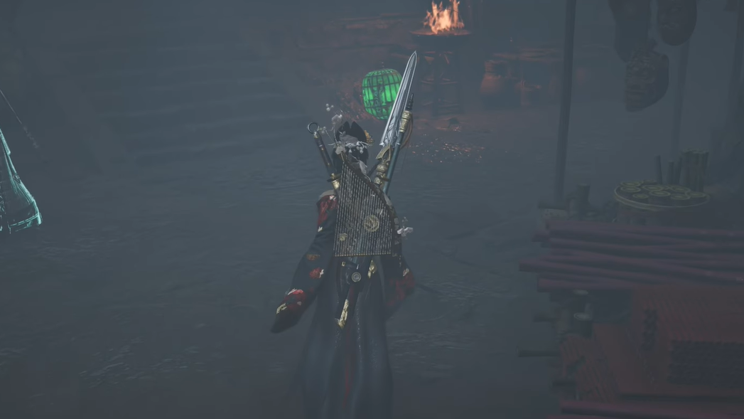 Step 1: From Liu Changsheng’s initial position in the Ghostlight Market, face into the mist‑covered streets and go right. Your goal is to follow the line of green lanterns deeper into the Market rather than turning back toward the entry cavern.