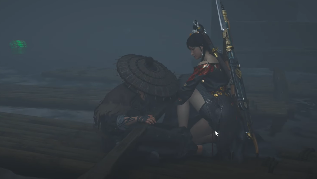 Step 3: At the base of those stairs, turn left instead of climbing. A disembodied voice calls out through the mist as you approach a raft — this is the boatman Jin Yunhai. Walk up to the raft and start a conversation.