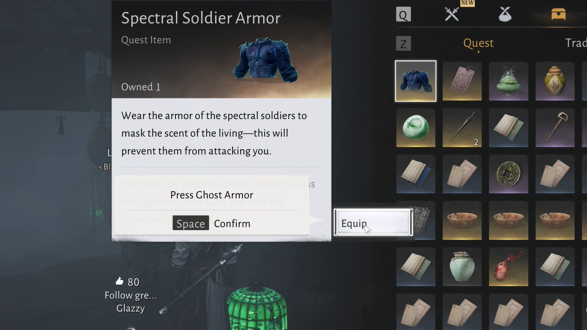 Bringing all three back allows Liu Changsheng to assemble the Spectral Soldier Armor. Once equipped from the Bag’s Quest tab, this armor causes Spectral Soldiers in the area to ignore you unless you attack them, which is essential for safely reaching the Ghost Gate and confronting the spectral warrior Zhu Yousheng at the end of the quest.