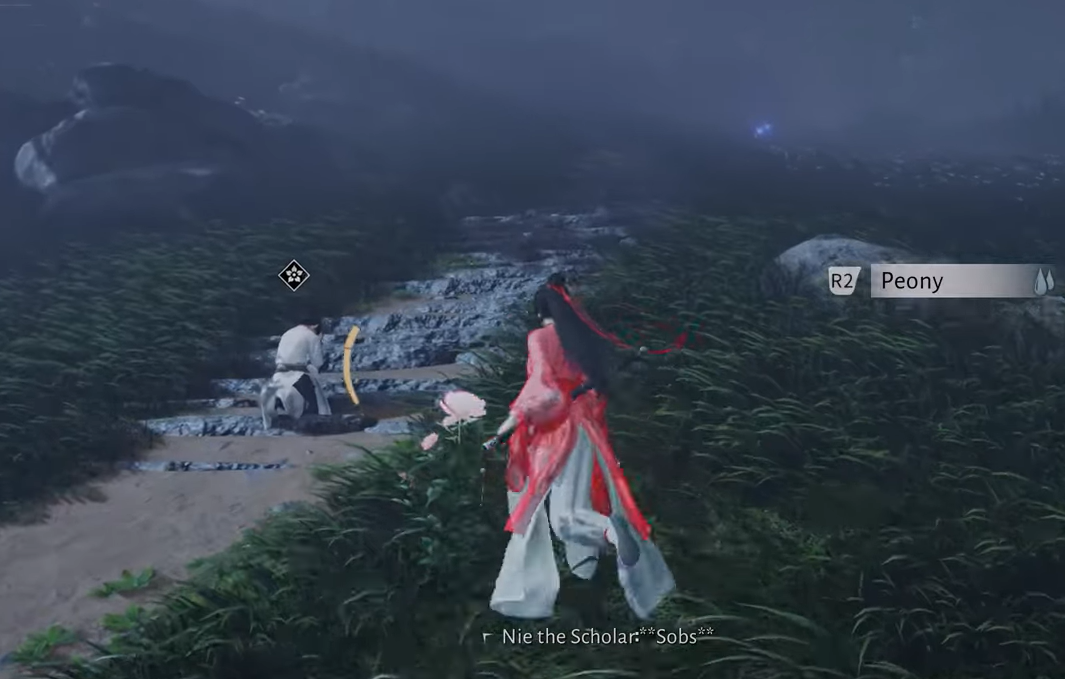 Step 7: Follow the road a bit higher until you see the white-robed NPC. Speak with him to lock the encounter in, then continue up the road to the two additional NPCs the quest points you to. After the dialogue here, the quest will instruct you to wait until a later time. Waiting until Yin hour and then returning to the initial stretch near Path of Karma allows you to find the white-robed NPC again, now weeping, and finish the conversation chain.