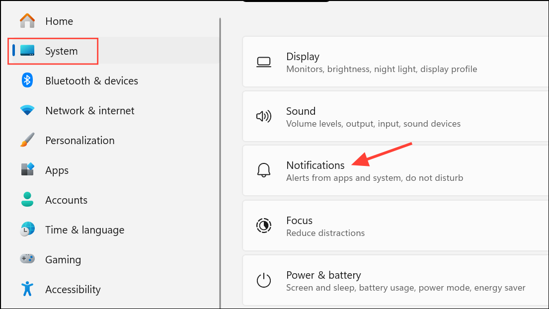 Step 2: In the left sidebar, select System, then click on Notifications from the main panel. Here, you control all system and app notifications.