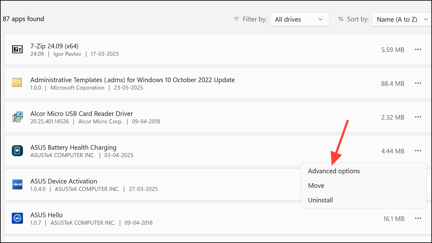 Step 2: Find the problematic app in the list, click the three dots next to it, and select Advanced options.