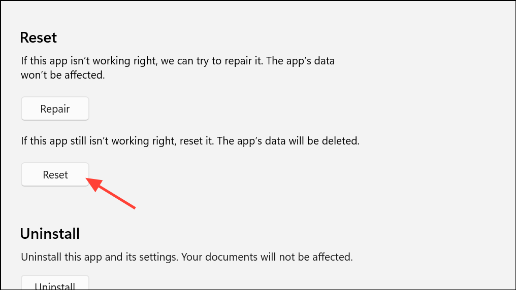 Step 3: Scroll down and click Reset. Confirm when prompted. This clears the app's data and settings but doesn't remove your files.