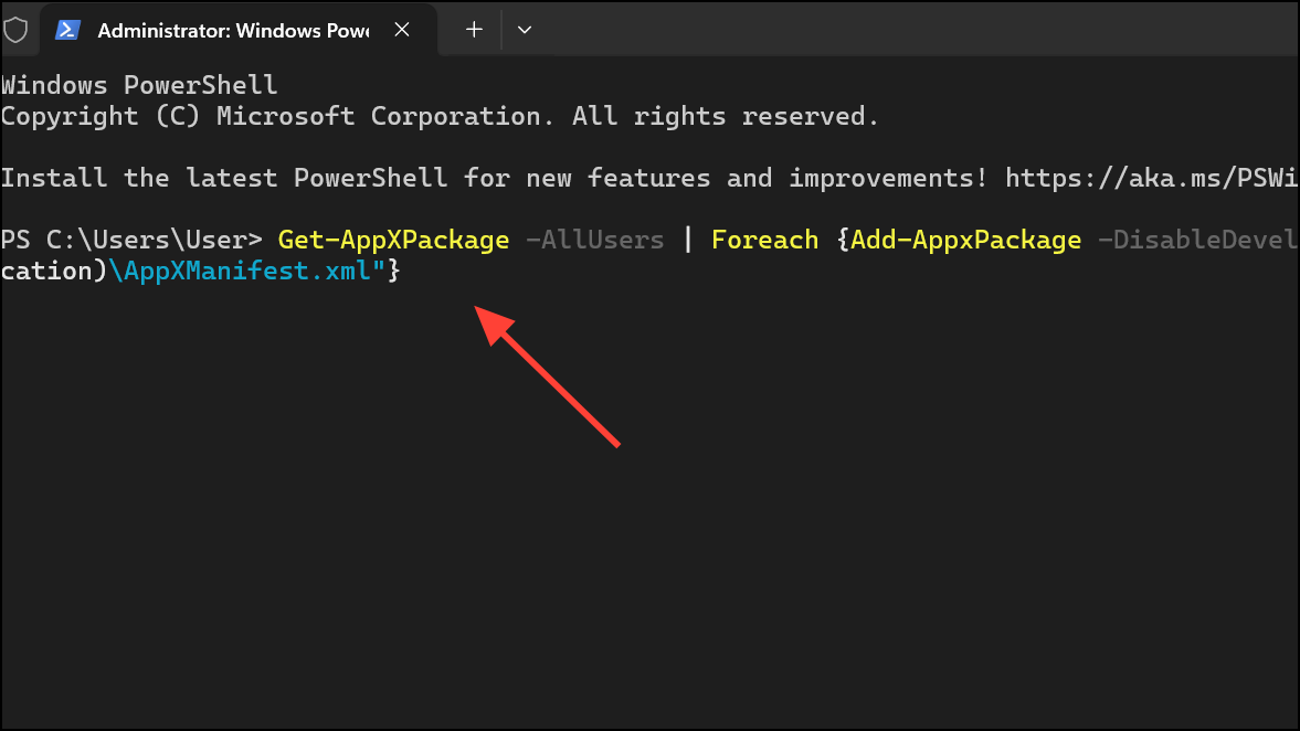 Step 4: If resetting doesn't work, you can re-register all Windows Store apps using PowerShell. Right-click the Start button, select Windows Terminal (Admin) or PowerShell (Admin), and run the following command: