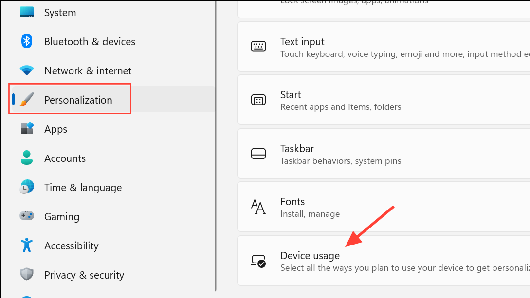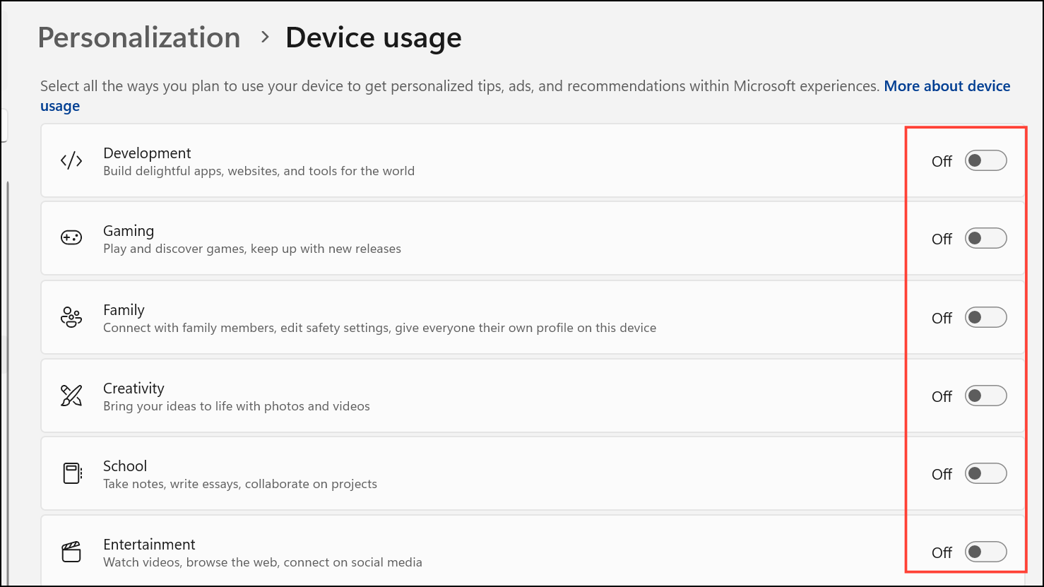 Step 2: Turn off all device usage toggles to prevent Windows from displaying usage-based suggestions or pop-ups.