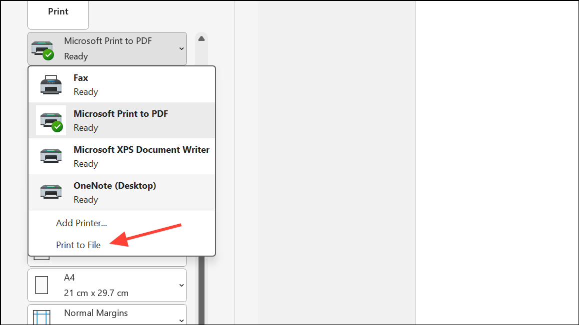 Step 2: In the print dialog box that appears, look for a checkbox labeled Print to file. This option is often located near the bottom of the dialog or in the Printer dropdown.