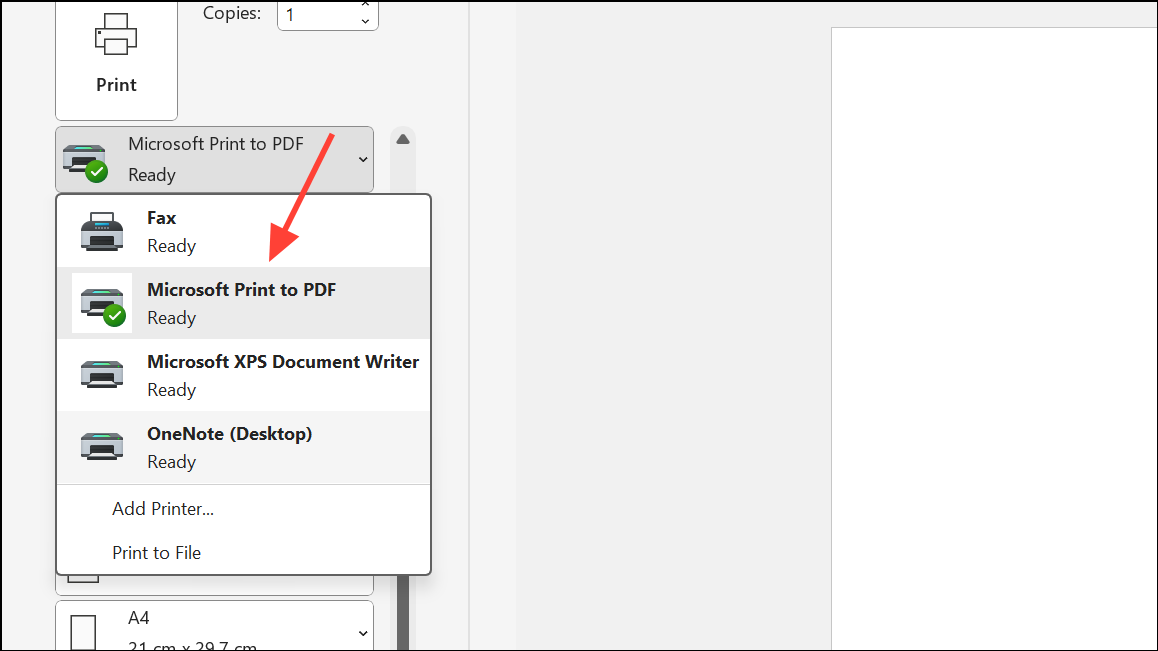 Step 2: If a virtual printer is selected, click the dropdown and choose your physical printer before proceeding. This prevents Windows from prompting you to save a digital file instead of printing.