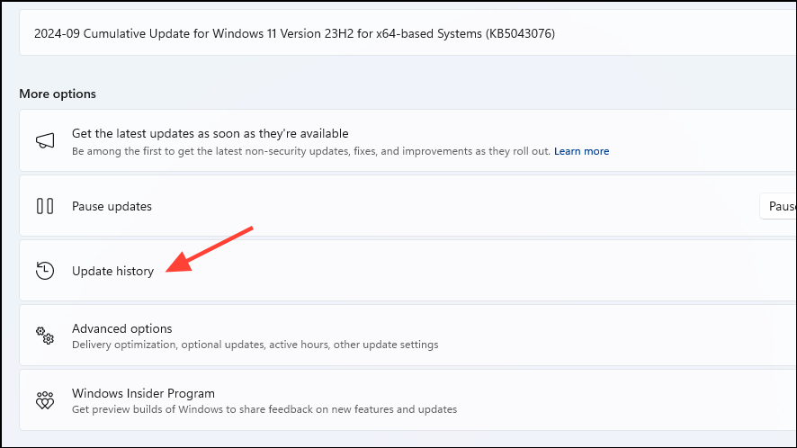 - On the Windows Update page, click on 'Update History'.