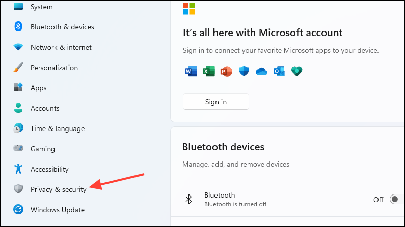 Win + Iand click on 'Privacy and Security' on the left.