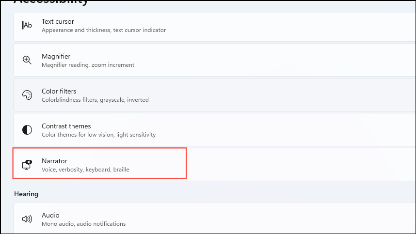 - On the Accessibility page, click on 'Narrator'.