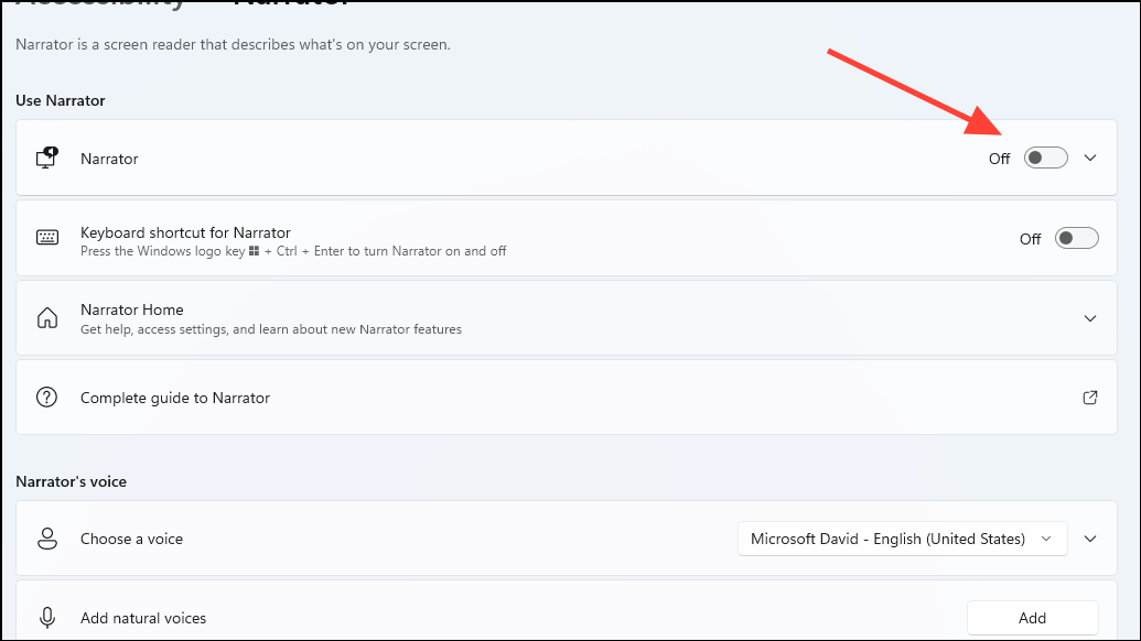 - Click on the toggle for 'Narrator' to turn it off.
