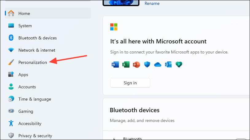- Open the Settings app and click on 'Personalization' on the left.