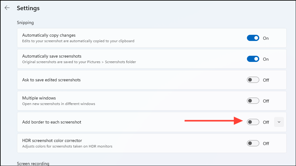 - Scroll down to the 'Add border to each screenshot' and click on the toggle to turn it off. After turning it off, restart your PC to remove all cached files of the tool.