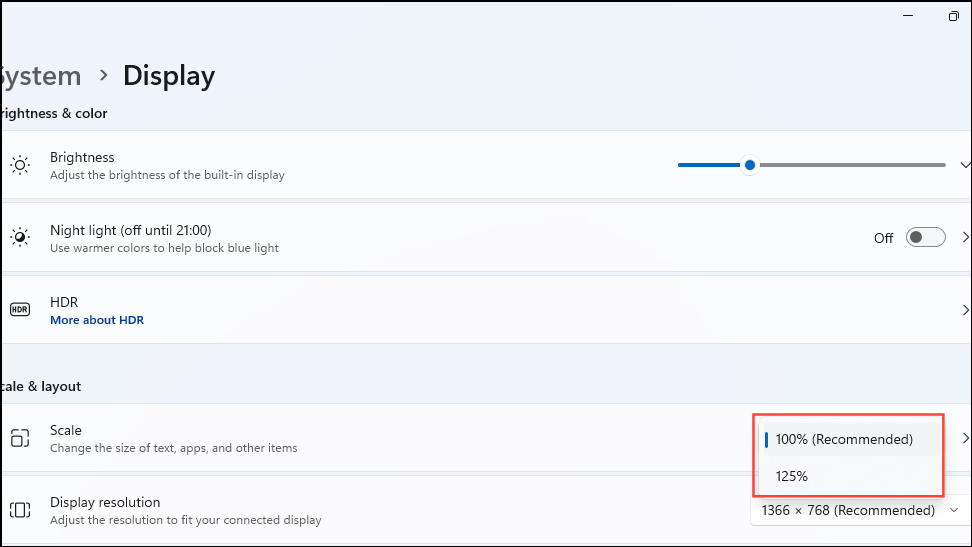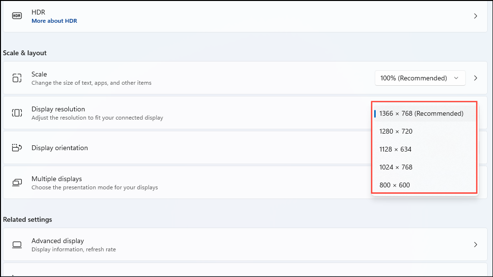 - Similarly, you can try changing the scale by clicking on the dropdown menu above the resolution option and see if that works.