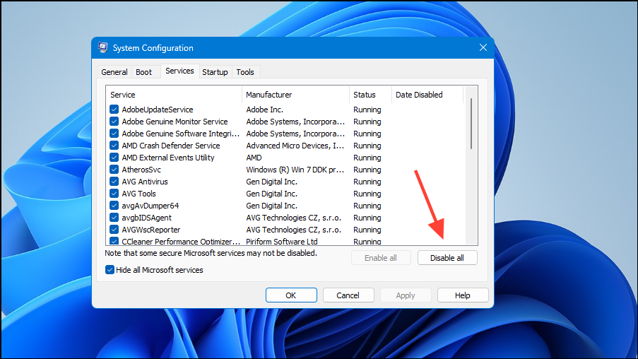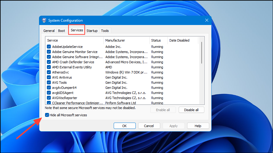 - When the System Configuration utility launches, click on the 'Services' tab at the top and then on the checkbox for 'Hide all Microsoft services' at the bottom left.