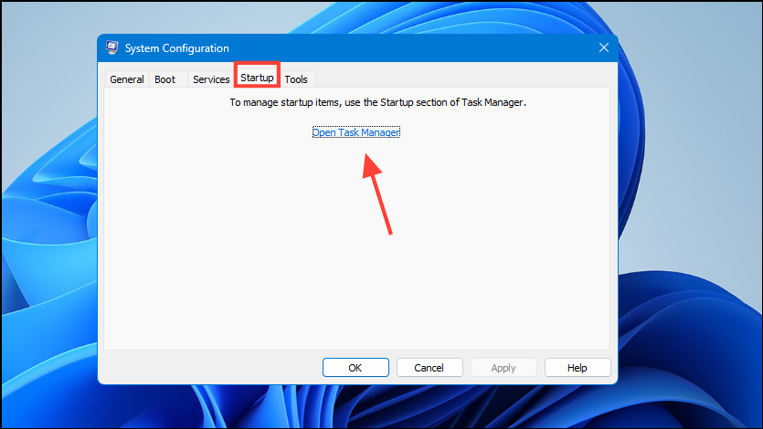 - Click on the 'Startup' tab at the top and then on 'Open Task Manager'.