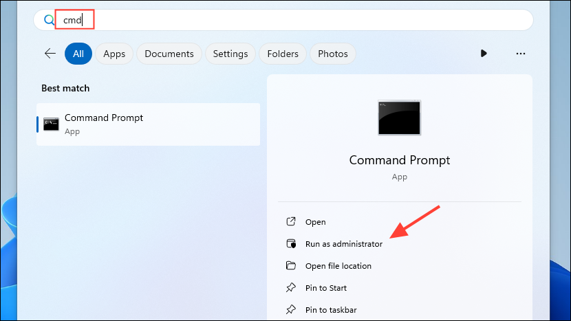 cmdand click on 'Run as administrator'.
