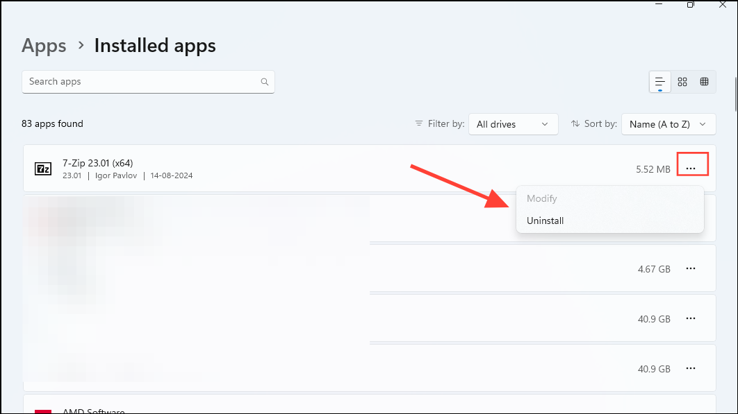 - Here you will see all your installed apps. To remove an app, click on the three dots to its right and click on 'Uninstall'.