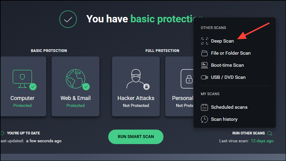 - When your antivirus program launches, click on the 'Deep scan' or 'Complete scan' option. Wait until the scan is complete and then follow the steps on the screen to get rid of any virus or malware affecting your system.