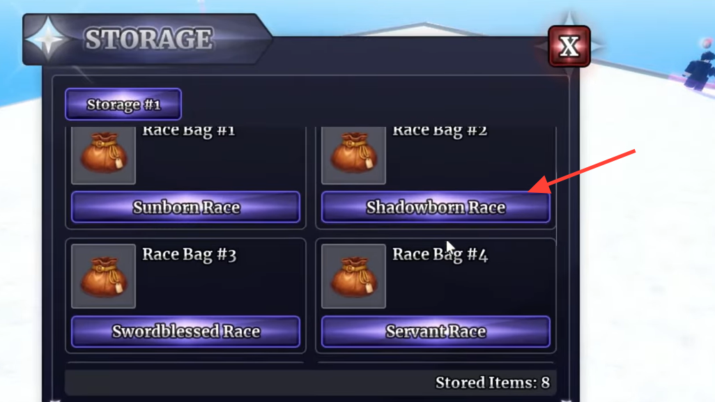 Use race reroll items from your inventory to randomize your current race. Shadowborn is a legendary-tier race with a low pull rate. Players should store other legendary or mythic races in the Race Bag storage system before continuing rerolls to avoid losing valuable alternatives.