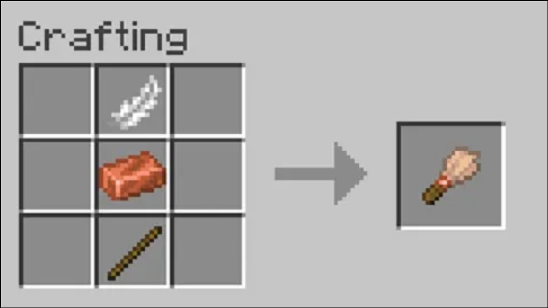 Step 1: Craft a brush. Recipe (3×3 crafting grid): feather in the top-center slot, copper ingot in the center slot, stick in the bottom-center slot.