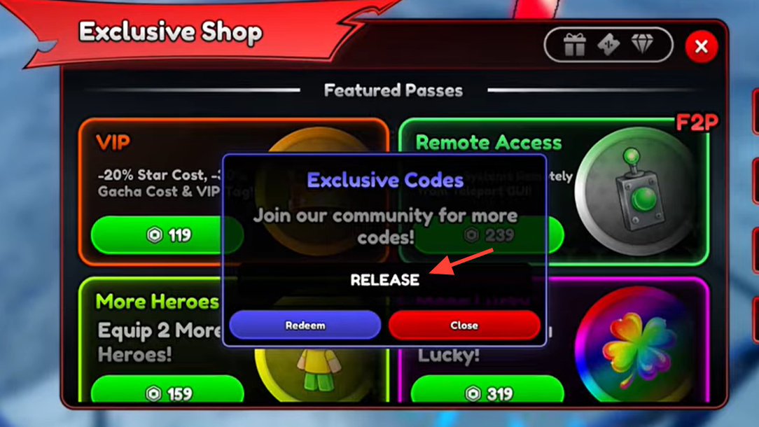 Codes occasionally distribute Gems or other rewards. The launch code RELEASE grants a full set of Tier 2 potions. To redeem it, open the Shop via the button on the left side of the screen, navigate to the Ticket/Coupon tab, type the code exactly as shown, and hit Redeem. Keep an eye on the game's official Discord server for new codes after major updates.