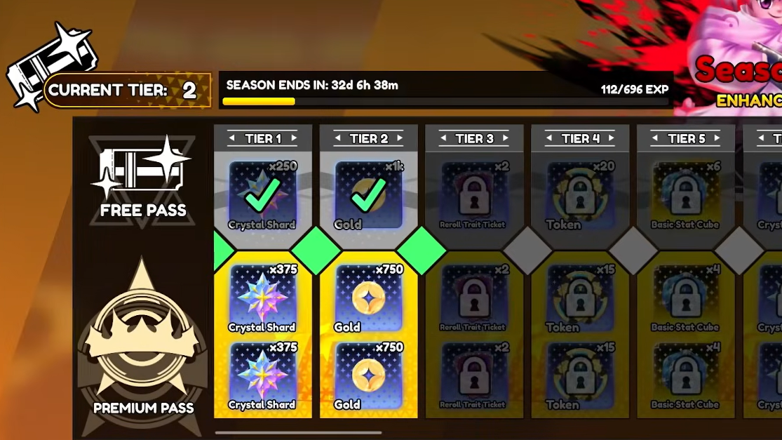 Season Pass. Completing quests earns Season Pass XP, which unlocks tiered rewards including Crystals and gems. The free track is decent; the premium track roughly doubles the output.