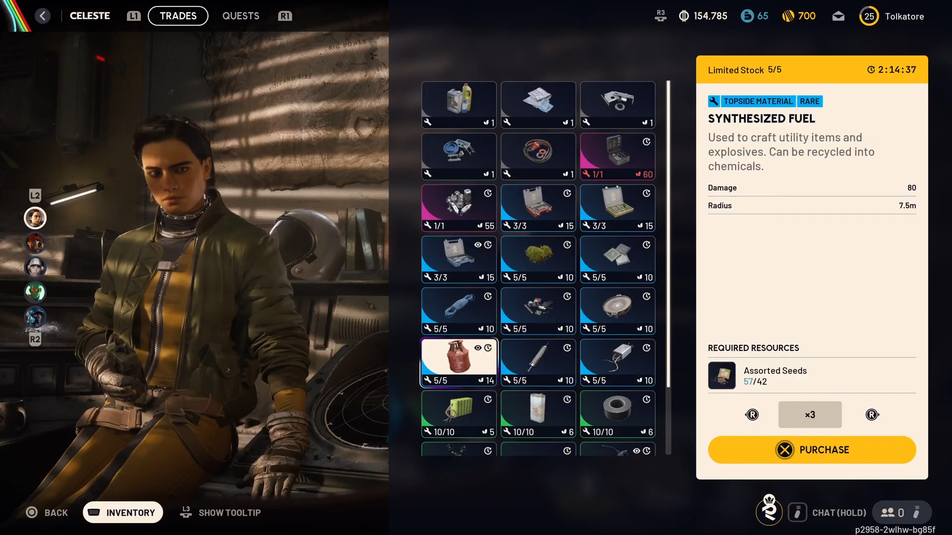 Step 2: Talk to Celeste and open her trade inventory. Look for Synthesized Fuel in her resource stock.