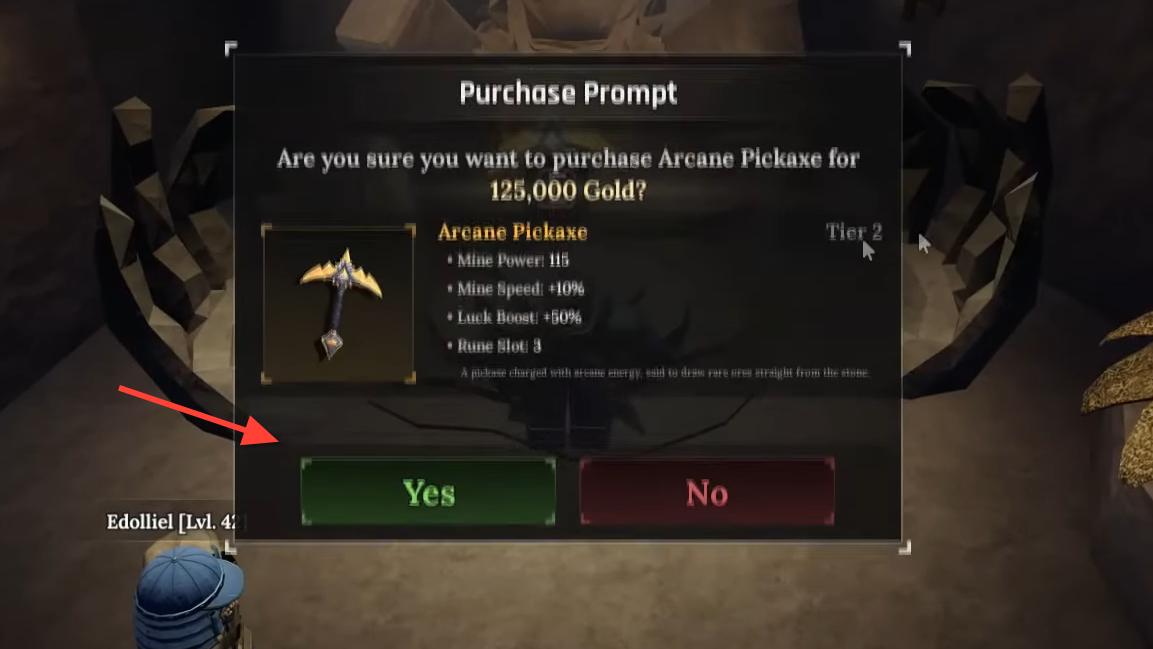 Step 9: Walk through the now‑open gate into the Fallen Angel cave. At the far end is the Arcane Pickaxe on a stand. Interact with it and confirm the purchase for 125,000 gold.