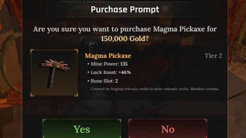 | Arcane Pickaxe | Late‑mid / early end game | 115 Mine Power, +10% Mine Speed, +50% Luck, 3 rune slots | 125,000 |