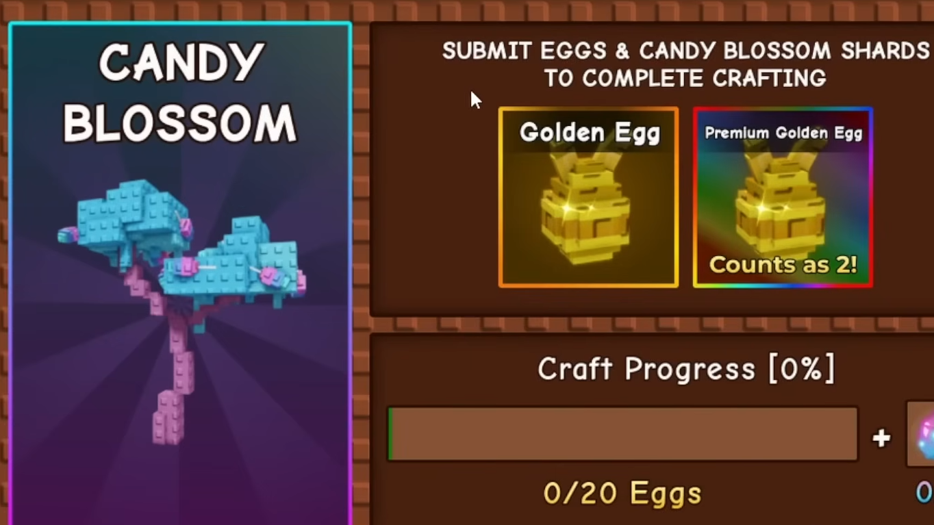 The Candy Blossom crafting station is on a sub-island. To craft one Candy Blossom 2026 Seed, you need to accumulate 50 Golden Egg points and hand over one Candy Blossom Shard. Regular Golden Eggs are worth 1 point each, while Premium Golden Eggs are worth 2 points.